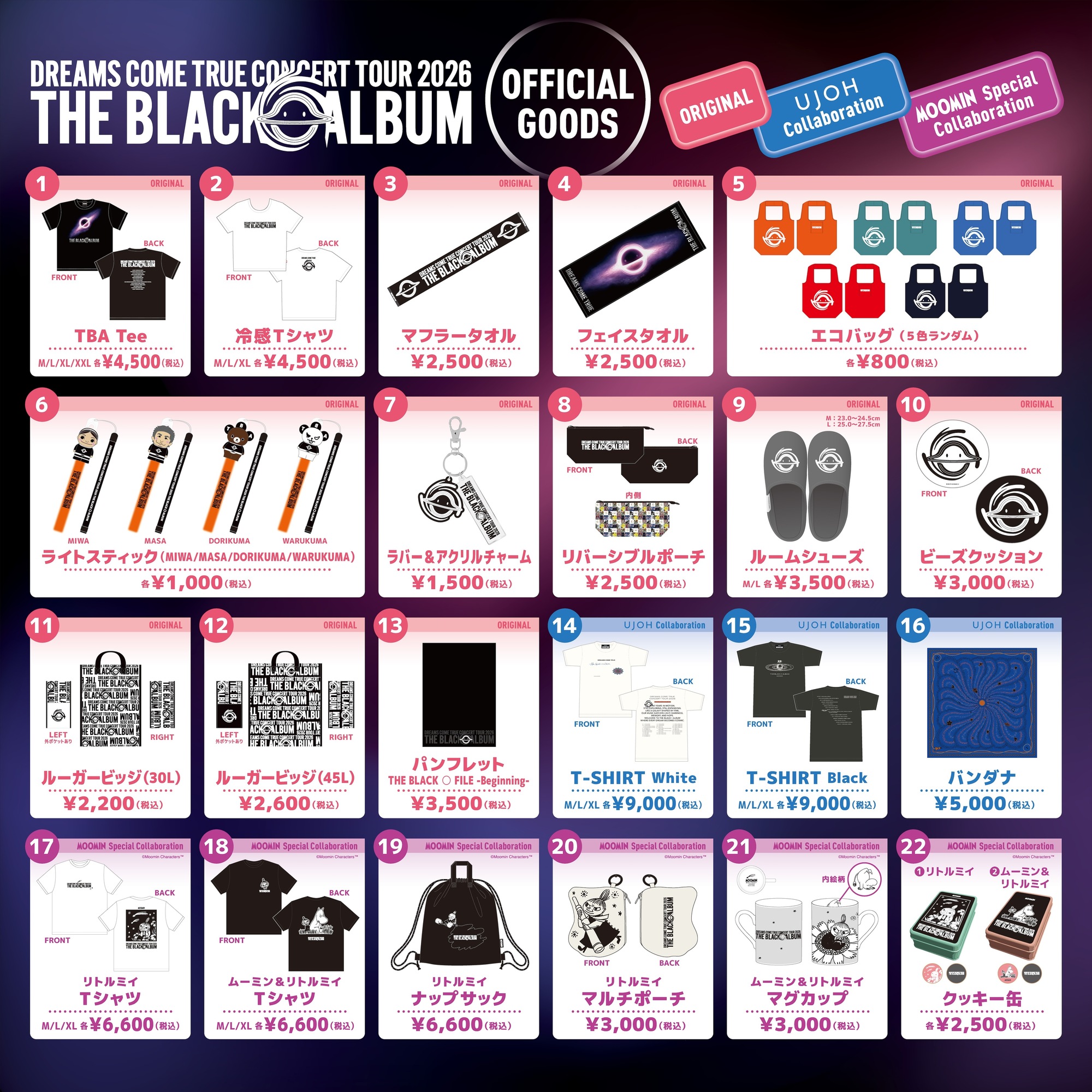アルバムやツアーロゴに可愛らしく存在する「ニコちゃんブラックホール*1」をメインにデザインし、Xのアンケート投票でいただいた内容を参考に、ドリカムのライヴといえばこれ!という定番商品から普段使いできるアイテム、今回のツアー衣装を手掛けるUJOHとのコラボグッズ【UJOH Collaboration】に、『THE BLACK ○ ALBUM』でもコラボした大人気ムーミンとの【MOOMIN Special Collaboration】と、さまざまなアイテムが登場します!